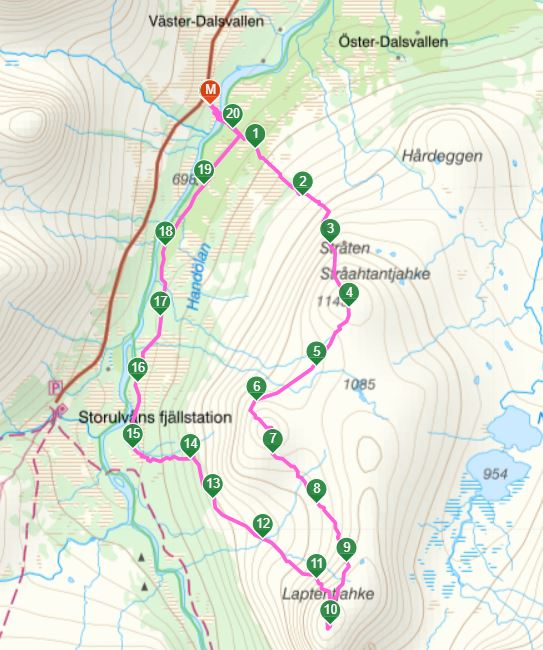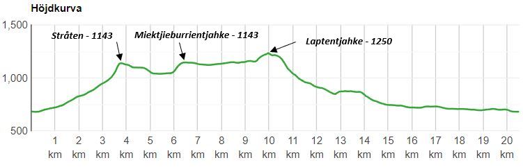 Den här dagen blev det 20,3 km med 892 höjdmeter. I princip lika långt som dagen innan men knappt hälften så många höjdmeter. Effektiv tid ute blev 4.07 h men totalt var vi nog ute i ca 5 h. Vi såg inte en enda människa under hela dagen på det stiglösa fjället, bara en handfull renar när vi kom ned till grusvägen.