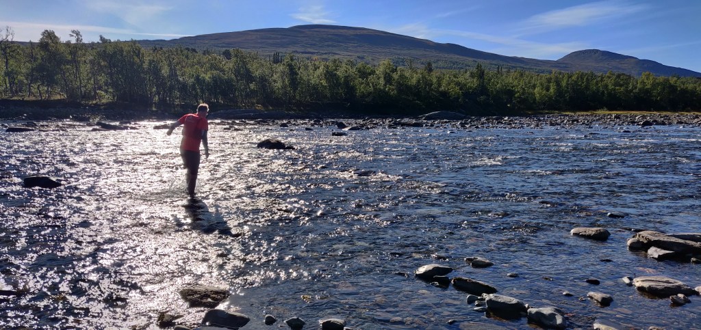 Till slut var vi i varje fall framme vid vårt vadställe över Handölan. Det var inga problem att komma över nu heller, det kändes t.o.m. lite varmare i vattnet nu när solen strålat hela dagen.