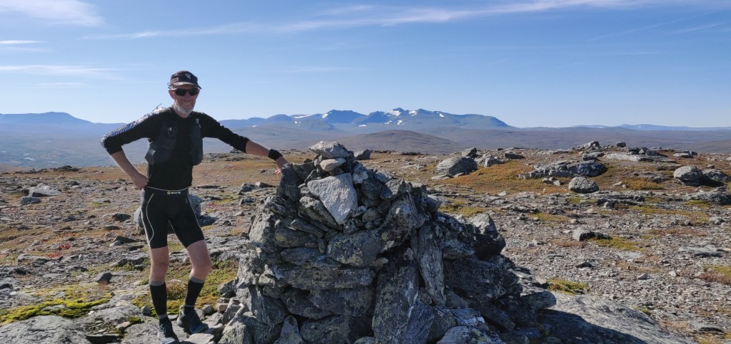 När vi kommit upp på Stråten och sugit in alla grymma vyer åt alla håll i det fina sommarvädret var det bara att njutlöpa mot solen, bort över fjällplattån och mot nästa topp, Miektjieburrientjahke. Försök att stava det sydsamiska namnet rätt utan att tjuvtitta :). Det var riktigt lättlöpt hela vägen fram, men själva toppen fick man runda lite åt västra sidan för att komma uppför den lilla branten som ringar in nästan hela toppen.