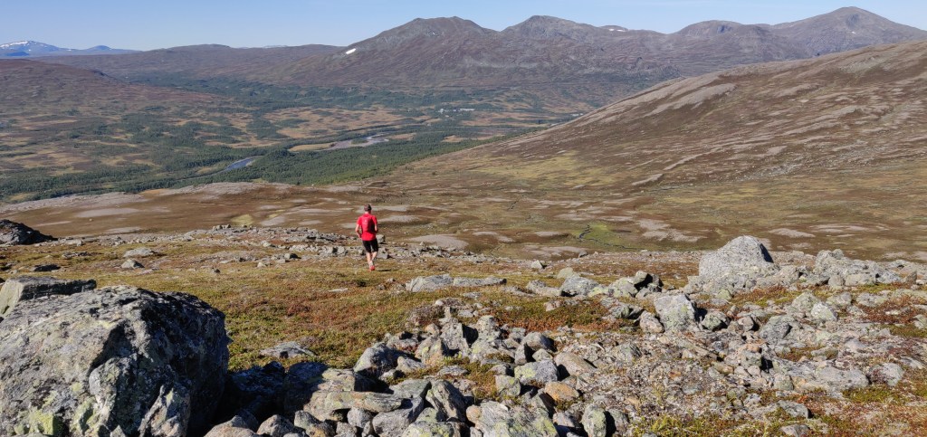 Vi fortsatte söderut ner i en grund dalgång bort till dagens tredje och sista topp, Laptentjahke. Det var bara att hålla höjd så mycket som möjligt och välja väg lite så var det lättlöpt även här.