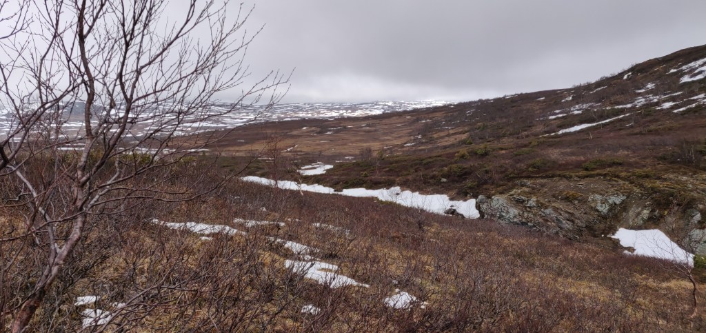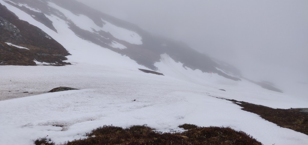 Det var tänkt som en topptur, men jag vek av ned i Tväråvalvet med den begränsade sikt det var uppe i regnmolnen. Trots allt ett nyttigt pass med snö, blött, lera och drygt 1100 höjdmeter.