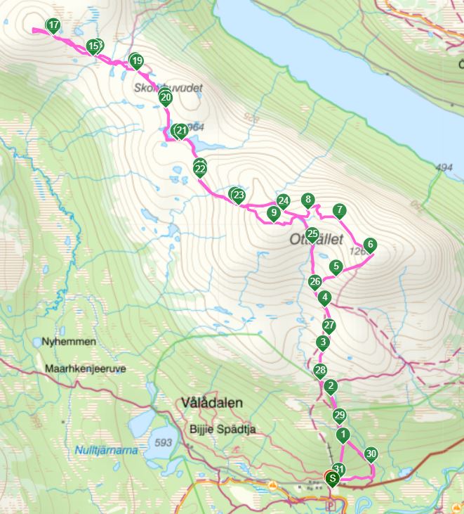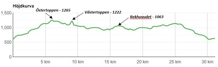 Årets första och troligen enda topptur blev till slut 31,1 km och 1560 höjdmeter. 18 km var på led men oftast en ganska bökig sådan, 4 km var väg nere vid Vålådalen och 9 km obanat. Det obanade var mellan Öster- och Västertopparna plus tur och retursträckan från leden till Rekhuvudet. Effektiv tid var 5:53 h, totalt var jag ute ca 7 timmar.
