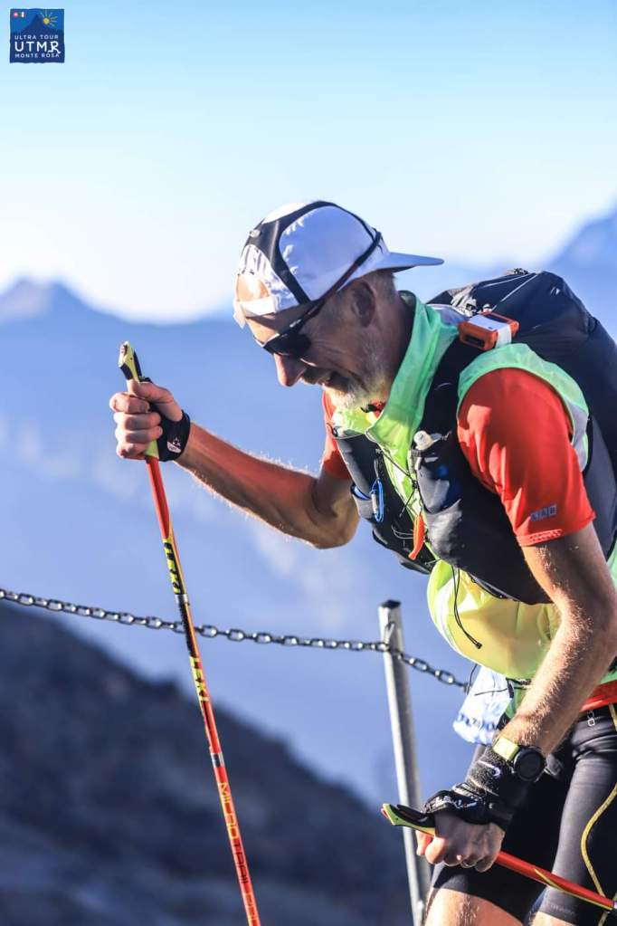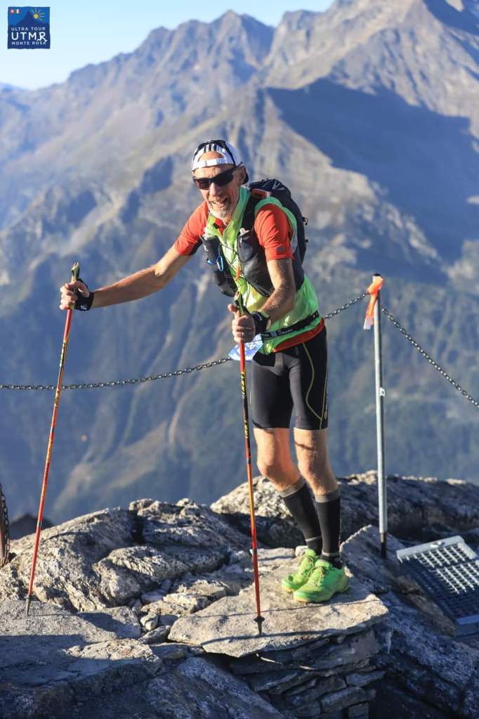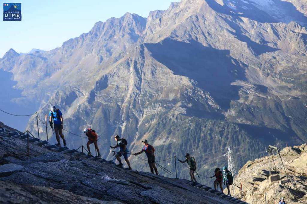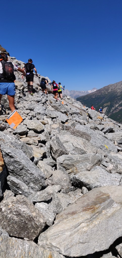 Eller….? Det är visst som vanligt i bergen, man är inte uppe när man först tror det. Efter CP är det nära 200 höjdmeter kvar upp till själva toppen av Monte Moro som ligger på 2985 möh. Upp över själva toppen är det en kul och annorlunda passage, nästan som lite Via Ferrata light utan sele. Här blir det lite fina bilder från UTMR’s flöde.