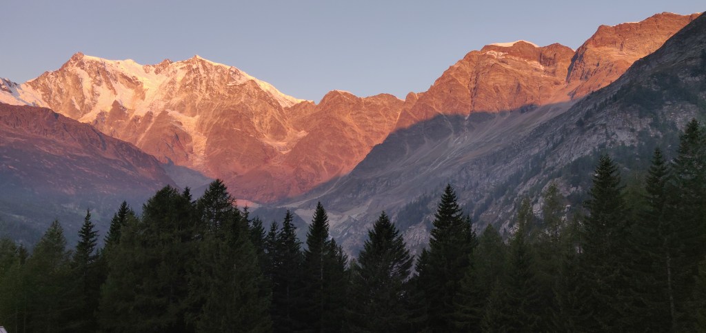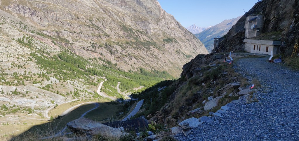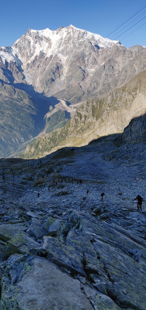 Dagen skall börja med en extrem stigning upp på Monte Moro och sen är det en ”technical descent” enligt beskrivningen. Frågan är hur tekniskt nedför det är och hur långt, det kan ju ta hur lång tid som helst egentligen. Mitt ”tidsschema” säger bara 40 min marginal till cut-off i Saas Fee som är halvvägs. Den minsta marginalen i hela schemat och det är den cut-off tiden som är oron snarare än förmågan att ta hela sträckan.