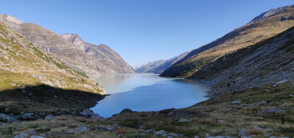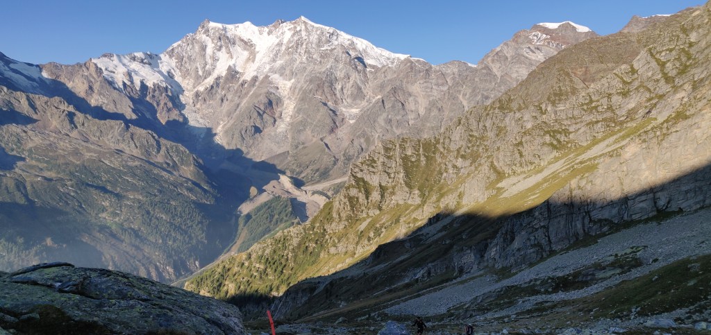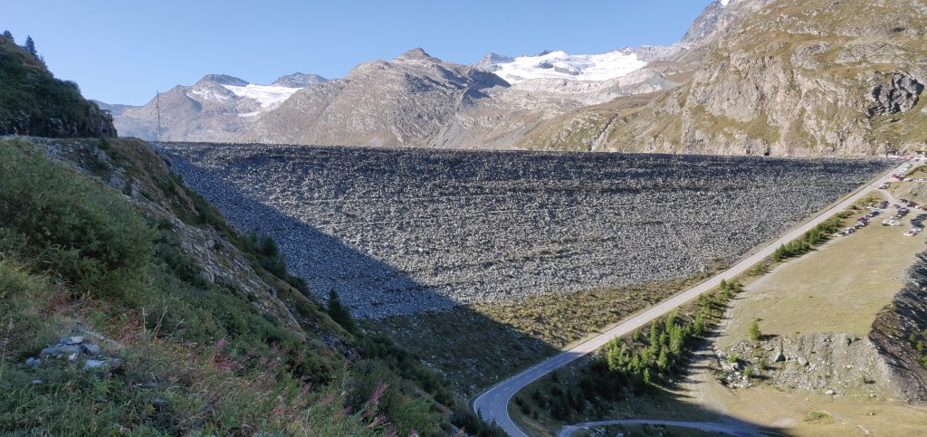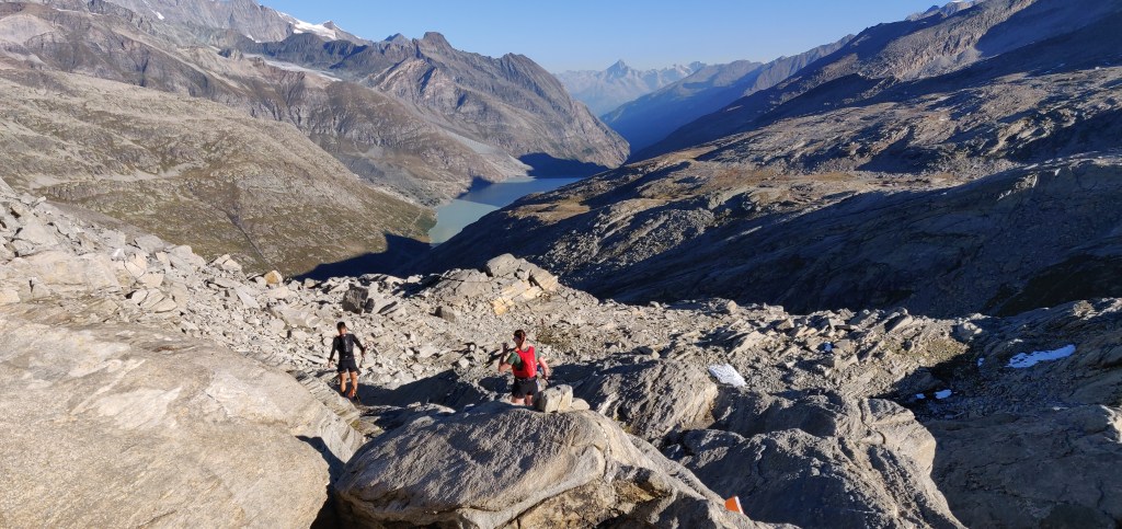Det är en lång sträcka utför i Saastal först ned mot reservoaren Stausse Mattmark. I början är det mycket tekniskt med klängande över stenar men det blir bättre och bättre med löpbarheten ganska snabbt och sedan går det faktiskt att springa ovanligt långt och ovanligt obehindrat utan avbrott. Utmed vattnet är det äntligen helt plant igen och nästan som en liten väg. Precis vid dammen blir det bonus. Där finns en CP för ett annat lokalt löplopp som vi mötte och de bjuder på ISO, vatten och banan.