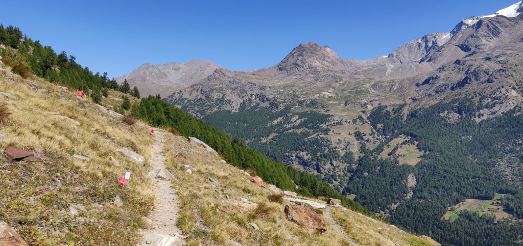 Det är dags för den fjärde och sista dagen, det är dags att ge sig i väg mot målet. Tillbaka till Grächen som ligger långt där borta på andra sidan bergen, genom en hel dal och runt ett berg till. Kroppen, benen och fötterna känns OK, det här borde gå bra, men…