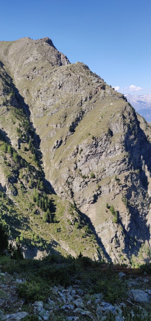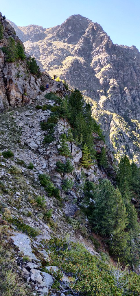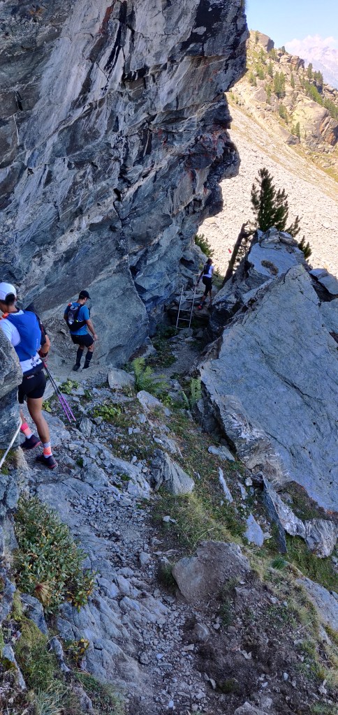 Efter rasbranten kommer en mil med ofta en ganska luftig stig högt upp på bergssidan. Upp och ned och bitvis mycket teknisk. Det känns som ett ändlöst antal bergsutsprång som skall rundas. In i en liten dal och ut runt berget bara för att där se ännu en dal och ett nytt berg att runda. De få ställen som har löpbar stig vill man inte riktigt springa på heller, för att inte riskera snubbla och rutscha utför eller få ett x meter fritt fall.