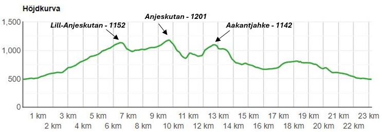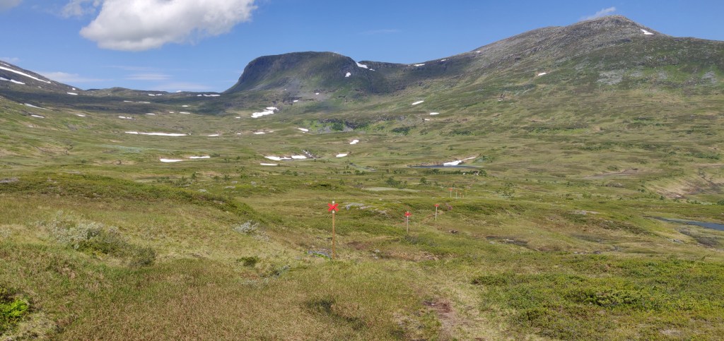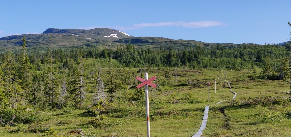 Jag hade siktat på en tidig start hemifrån för att undvika den värsta värmen och med de ljusa nätterna vaknar man tidigt så jag rullade från Frösön redan strax före 5 på morgonen. Framme på parkeringen utmed Anjanvägen vid 7 var det bara att ta en macka som en andra frukost och ge sig iväg uppåt. De första 2 km upp genom den glesnande skogen och lite blöta myrar var det spång, det blev en fin mjukstart sedan var det bara att sköta sig själv.