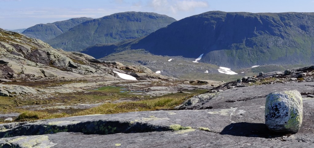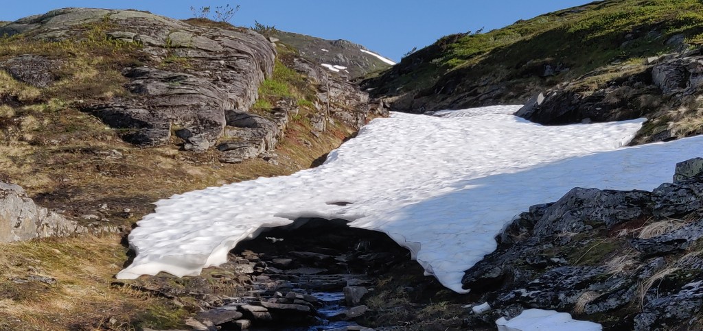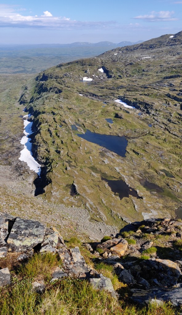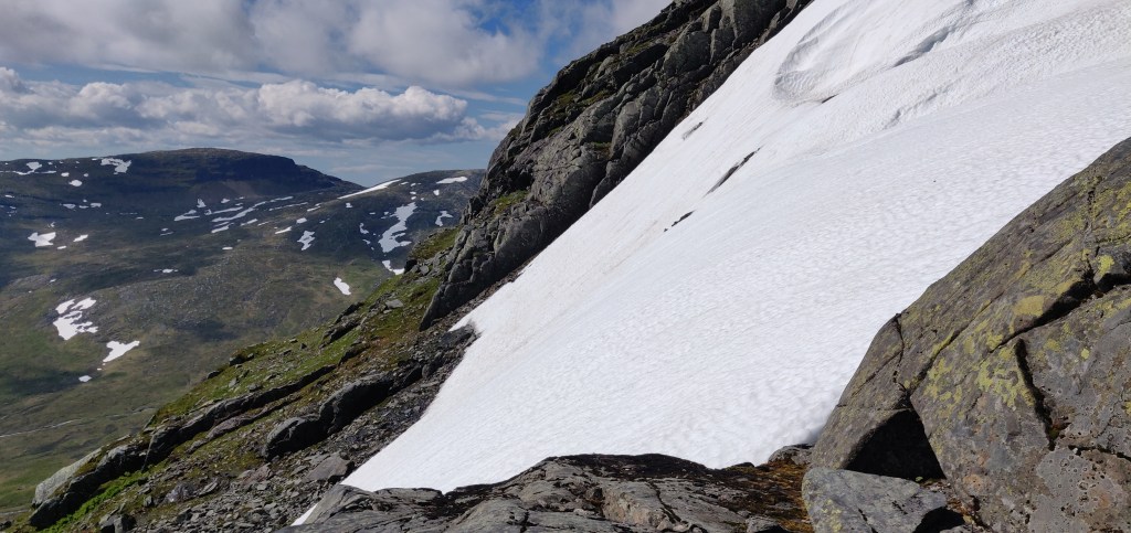 Nu är det mitt på dagen och solen har drivit upp temperaturen rejält. Det kommer bli hett nere i Styrdalen på vägen tillbaka, men här uppe fläktar det skönt. Jag fortsätter bort till passet mot Mehkentjahke där jag sett att det är brant med mestadels grönt och det sett möjligt ut att komma ned. Det lyckas men det blev lite scrambling nedför i början för precis i klyftan där branten började låg snön kvar så jag fick kravla nedåt i en spricka vid sidan om.