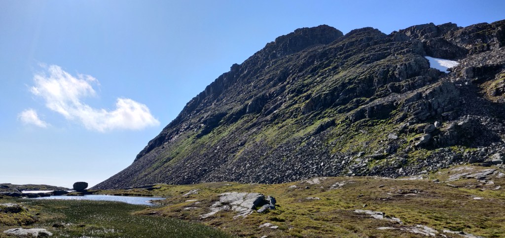 Nere från dagens första topp var det bara att ta sig vidare in i Skäckerfjällen en liten bit till och de ser riktigt läckra ut. Först över en liten platt med små tjärnar och sedan upp på Anjeskutan.