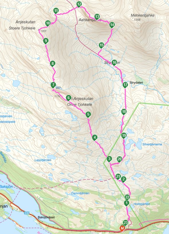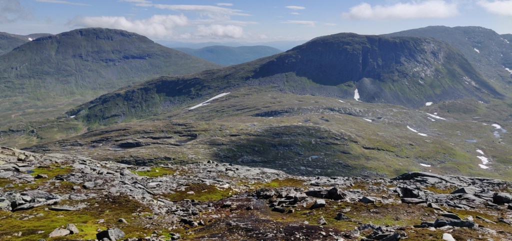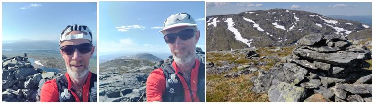 Sommarens första topptur blev totalt 22,8 km med 1360 höjdmeter. Effektiv ”löptid” 5:15 h, totalt var jag ute ungefär 6 h. 10 km av sträckan gick på leden, resten var helt obanat. Bortsett från branterna var fjällen riktigt löpbara med väldigt lite undervegetation, mycket slät mark och berghällar. Det som var lite drygt var på leden i Strydalen och ned till där spången började, där var det fortfarande väldigt blöt efter vintern och regnen den senaste tiden.