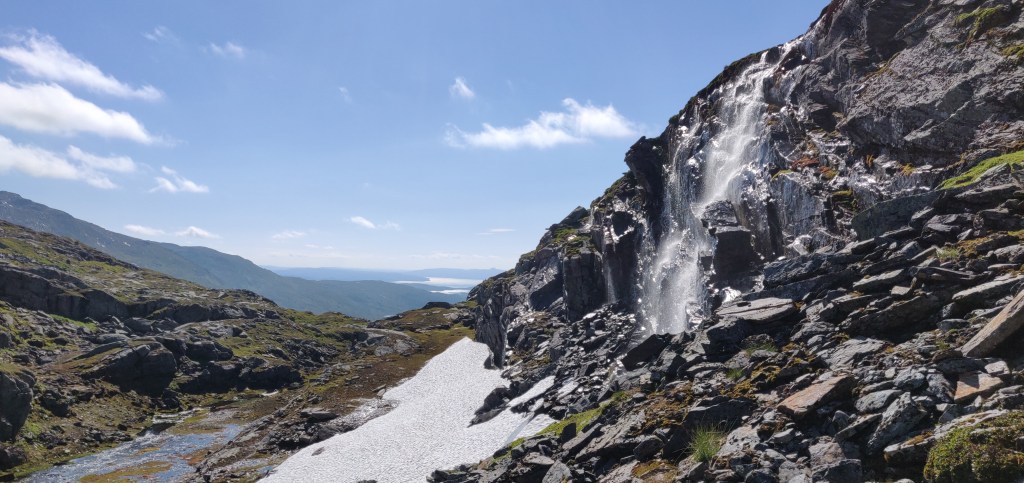 Först skall jag ned i dalen från Anjeskutan. Det är fin löpning och lagom sluttande till en början, men på slutet blir det brantare och stenigare. Jag rundar nedanför ett snöfält genom smältvattnet och får sedan klänga mig utmed berget bort åt vänster. Vänder mig om och ser att jag lyckats passera smältvattnet precis ovanför ett litet vattenfall.