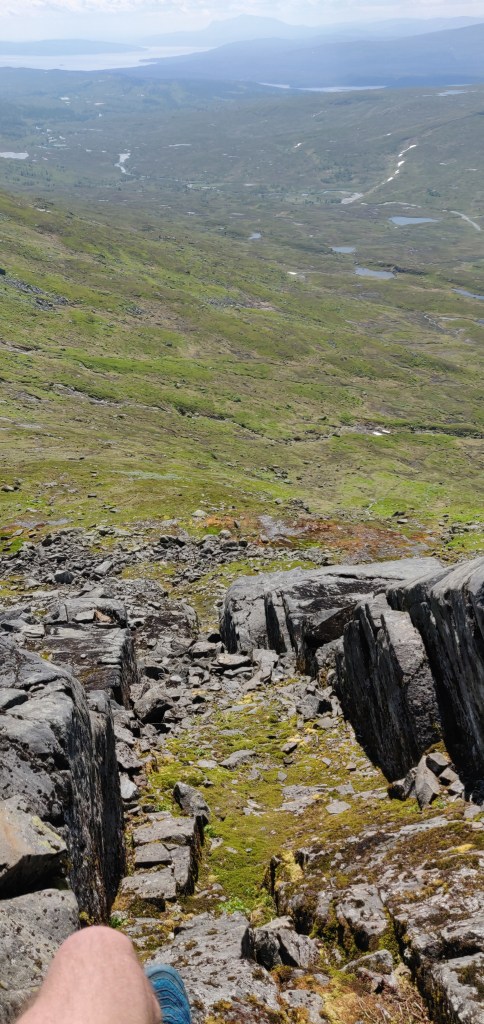 Försökte hålla mig bergsryggen så mycket som möjligt och hittade hela tiden lite hyllor och klyftor för att ta mig ned. Längst ned fick man ta en lite brantare väg för att inte hamna nedanför en större bergskant utmed Anjeskutan.