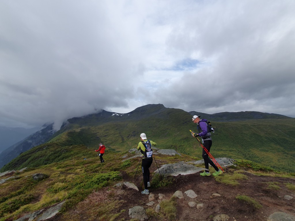 Det blir lördag morgon och det regnar kraftiga men korta skurar till och från, det är 12 grader nere vid fjorden och lär vara bara +3 och blåsa uppåt 20 m/s på högsta toppen. Molnen är täta men så pass höga att vi kan se alla bergen. Det är ett väder som vi kommer att ha med oss hela dagen så det blir inga soliga ”reklambilder” i bloggen från detta lopp.