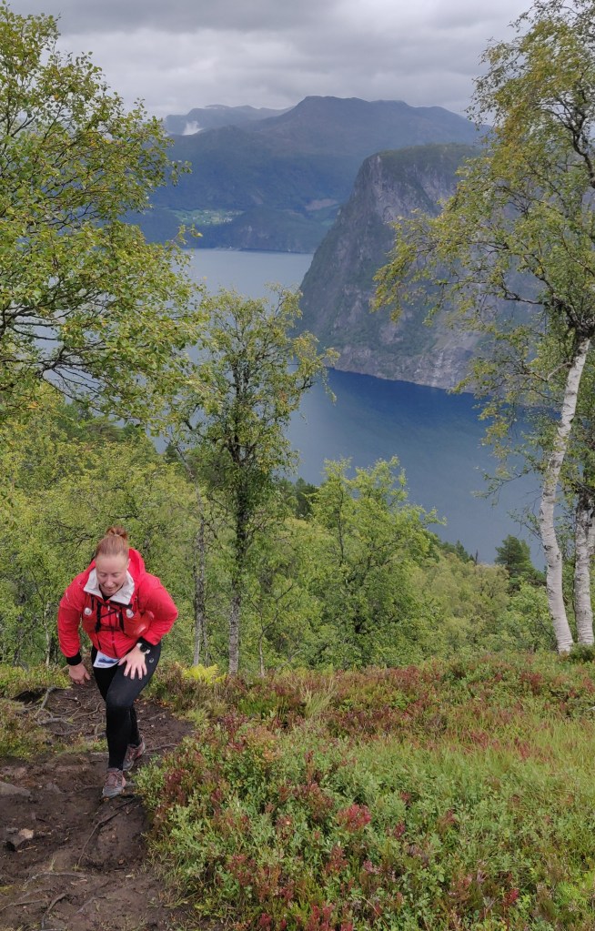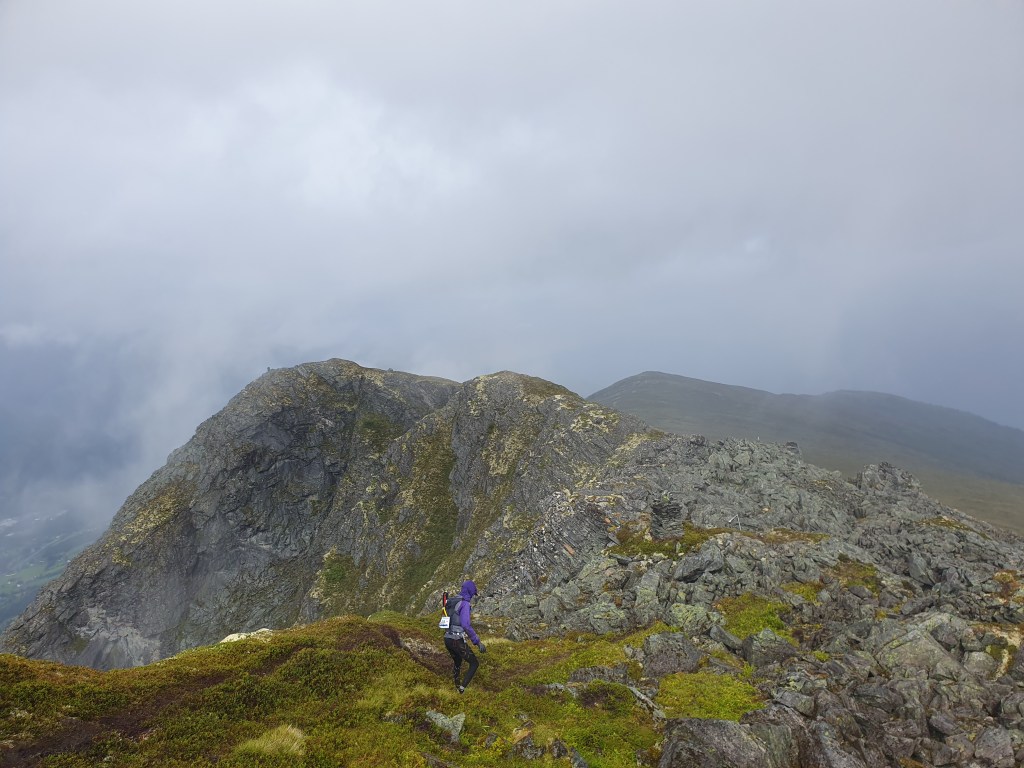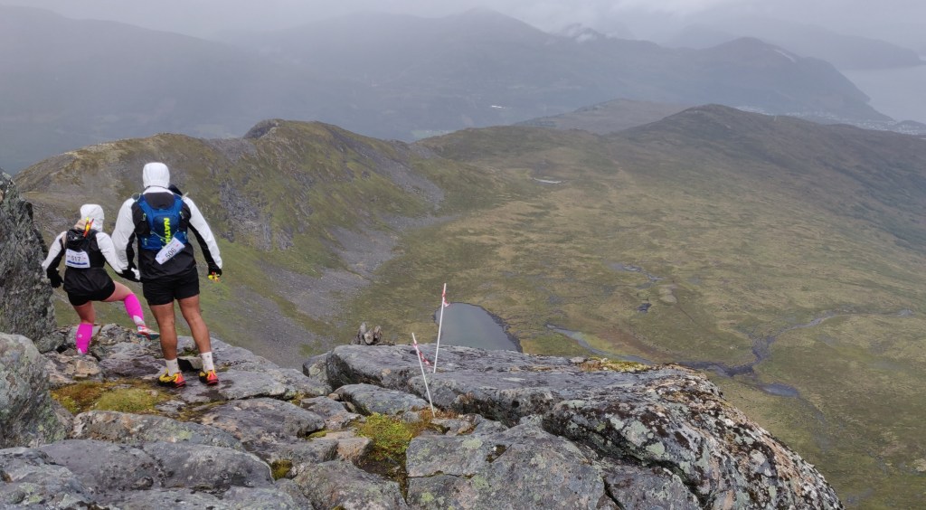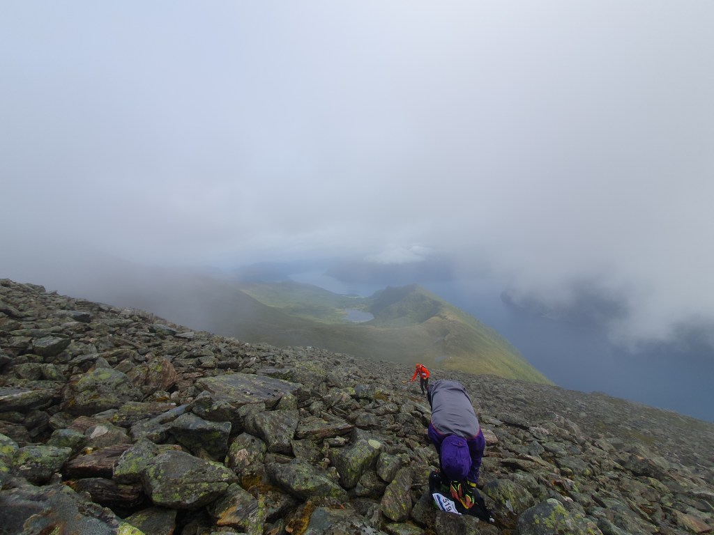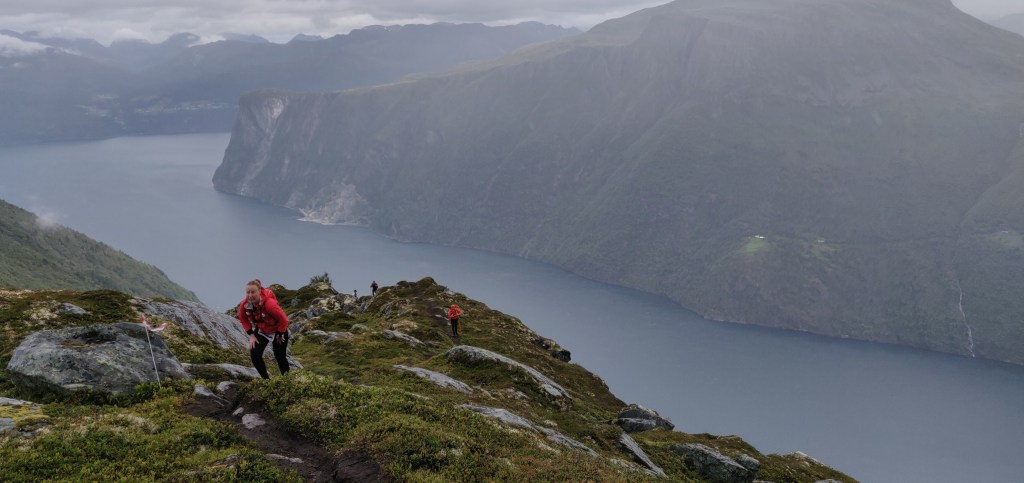 Nu började en riktigt fin sträcka med hyfsat löpbar stig i 3 km uppe på en ganska bred bergskam precis i trädgränsen. Trots molnen är det grymma vyer ned mot fjorden och bergen runt om på andra sidan. Den fina sträckan avslutas med en liten brant med lätt scrambling upp över 1000-meters nivån. Där kommer vi upp på en hylla som känns nästan ha fritt fall ned till fjorden.