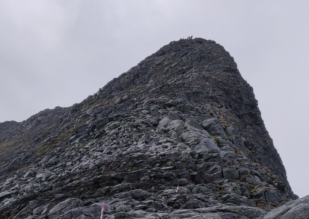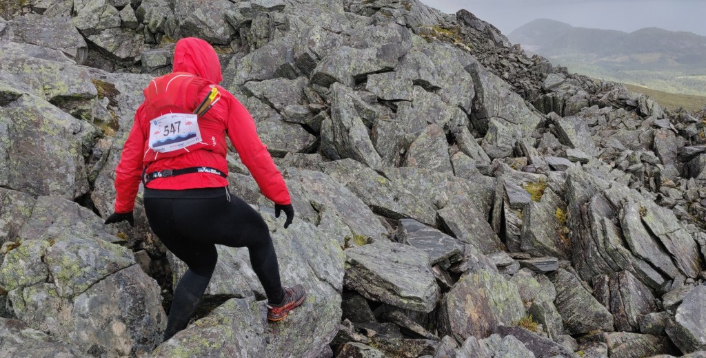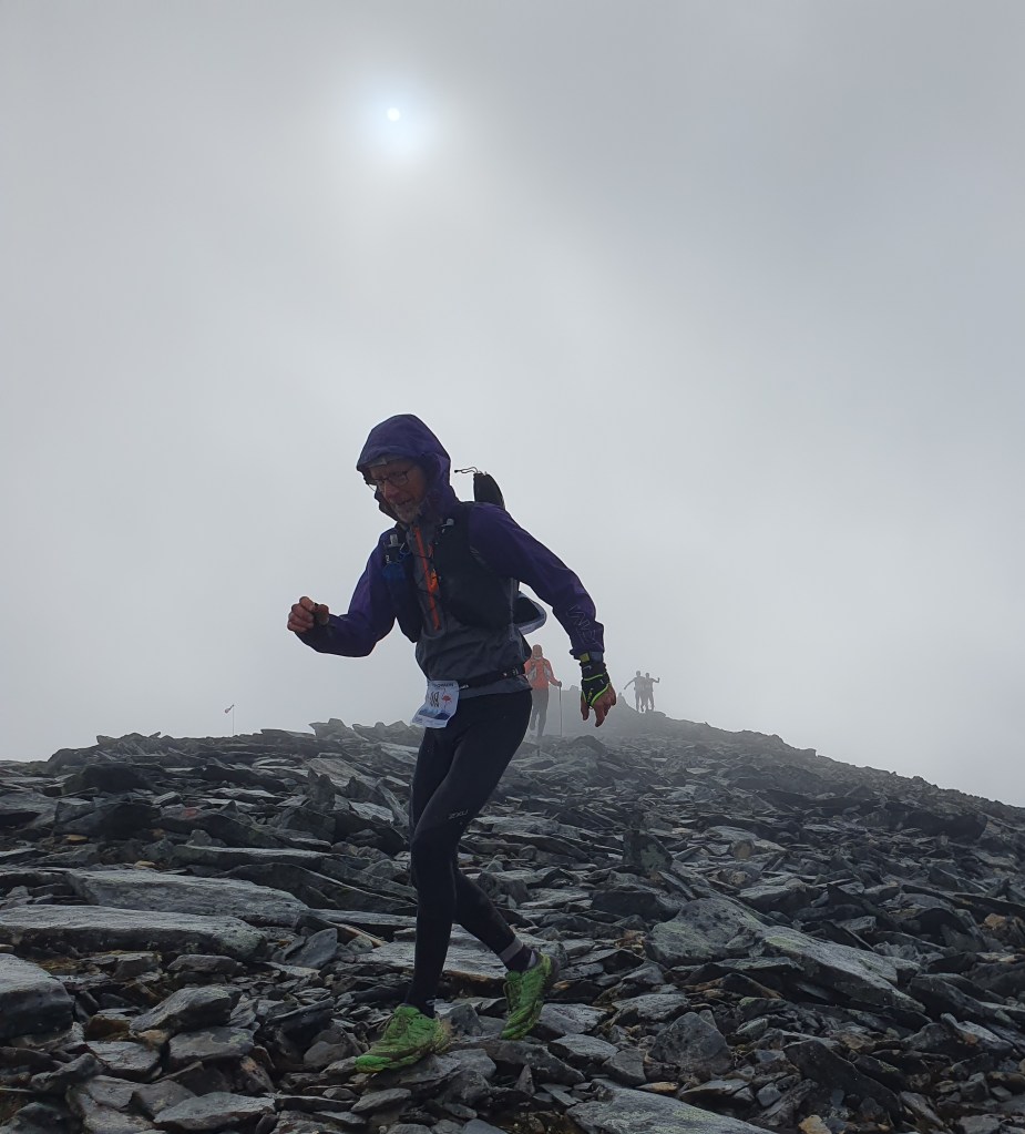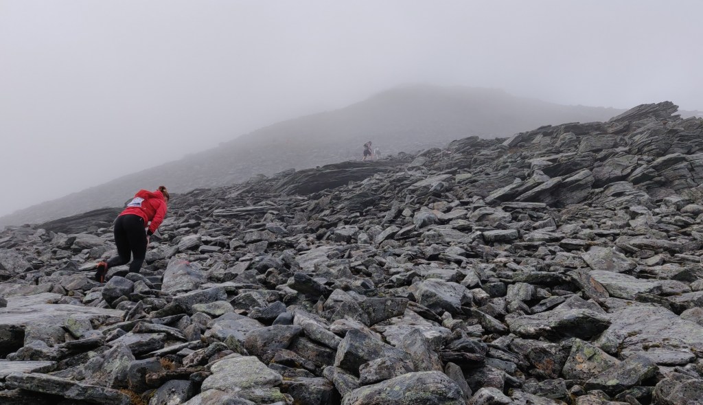 Molnslöjorna sveper in lite över bergen och stenen tar vid på marken. Vi har nästan 500 höjdmeter kvar upp till banans högsta punkt, Fremste Blåhornet 1478 möh, och det är bara sten hela vägen upp. Trots stenen var det jämförelsevis lätt att trippa uppåt här även om det krävde lite händer så jag fick packa ned stavarna, de kom inte fram något mer under dagen. Här kändes det som att vi hade god marginal till cut-off efter 29 km, på toppen hade vi ju kommit 11 km och gjort det mesta av stigningen på delen av banan till cut-off.