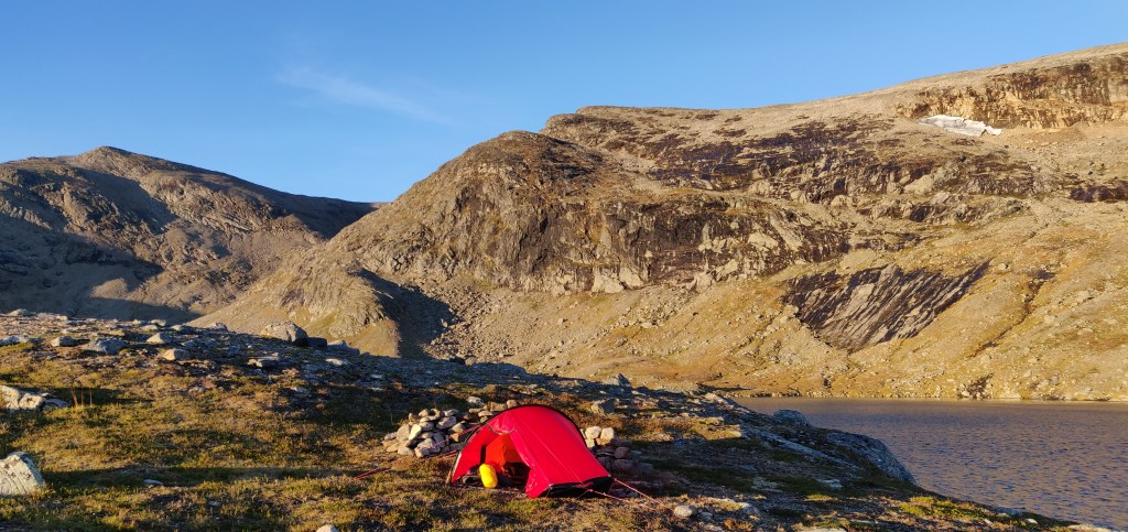 När det började ljusna efter 6 var det dags för morgonprocedurerna och efter någon timma når solstrålarna fram över bergskanten. Det skulle bli en magiskt fin sista sommardag i fjällen för i år, med klarblå himmel, strax över 20 grader, i skuggan, och knappt någon vind! Först var det de två topparna på Västra Bunnerstöten som skulle besökas innan det var dags att vända hemåt.