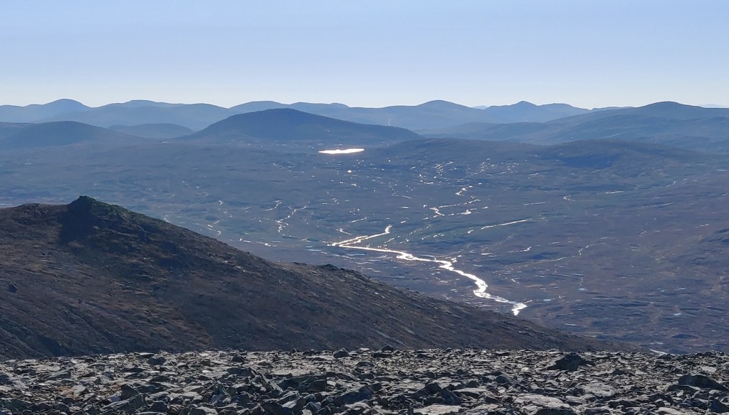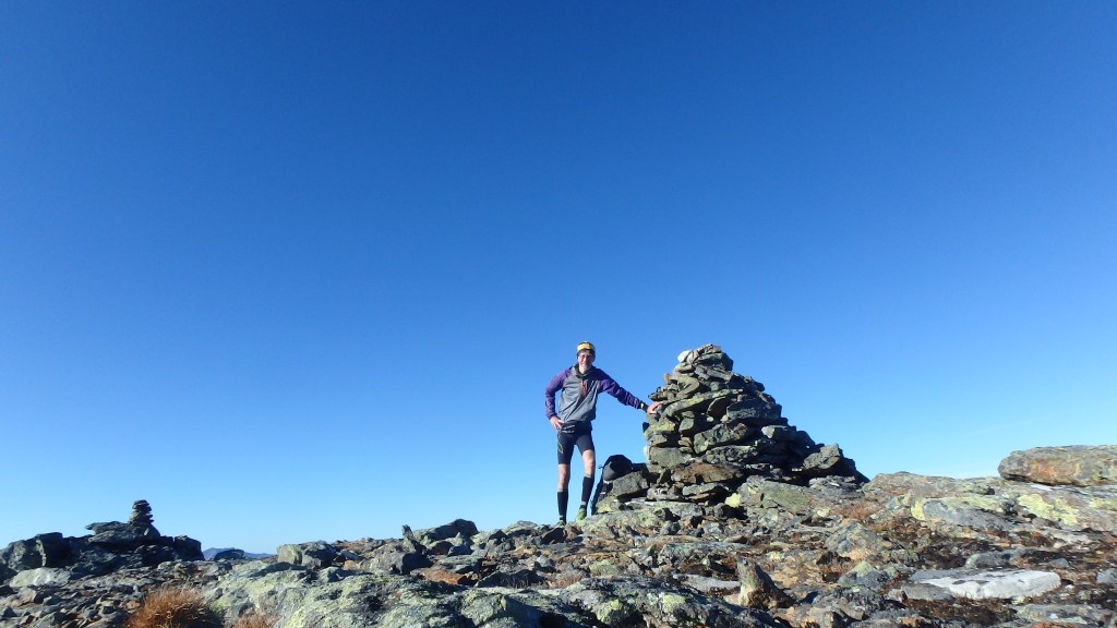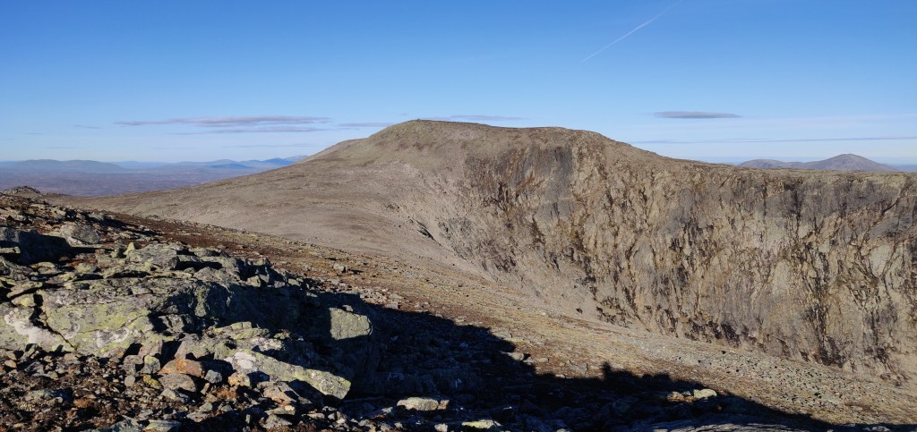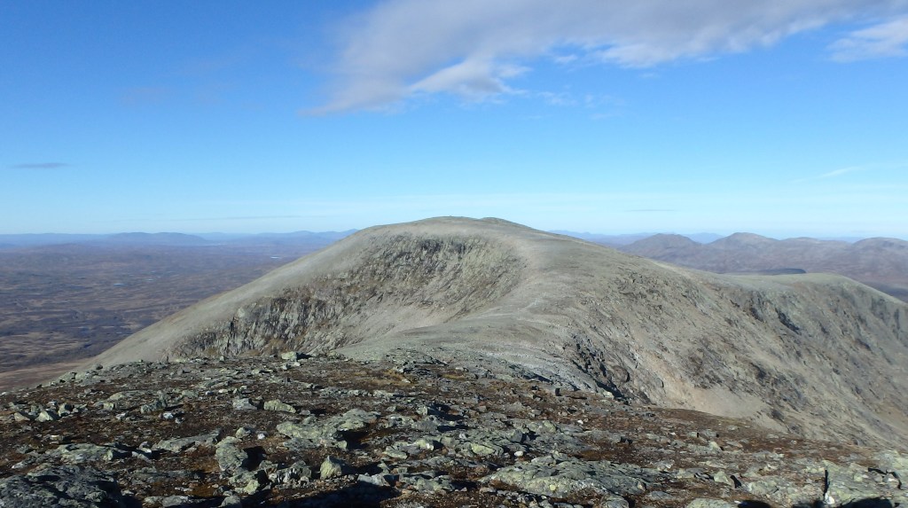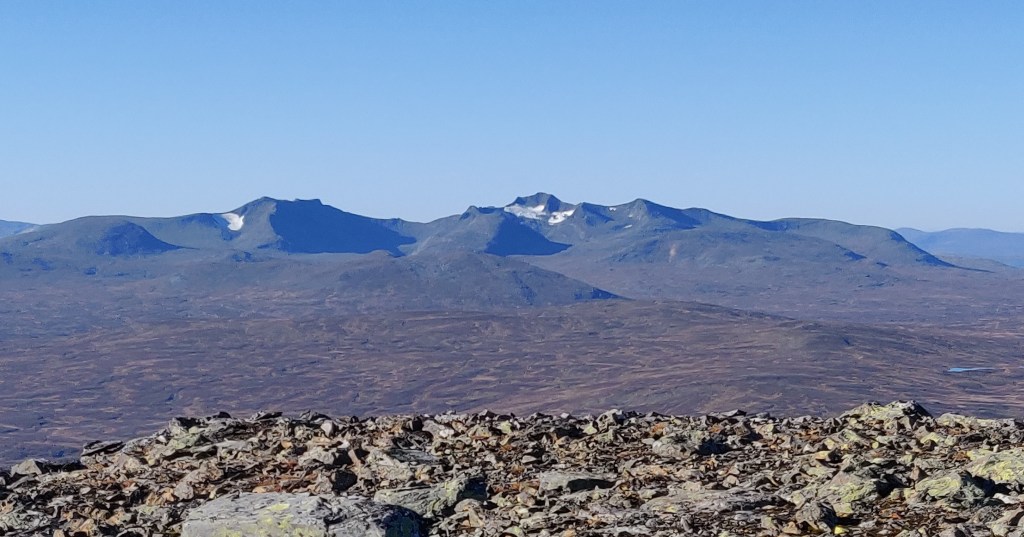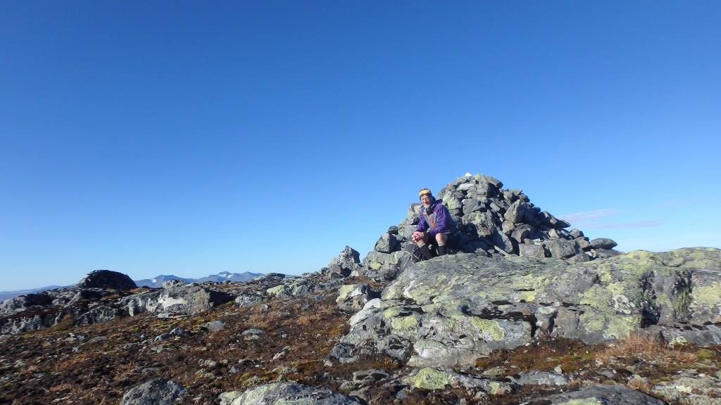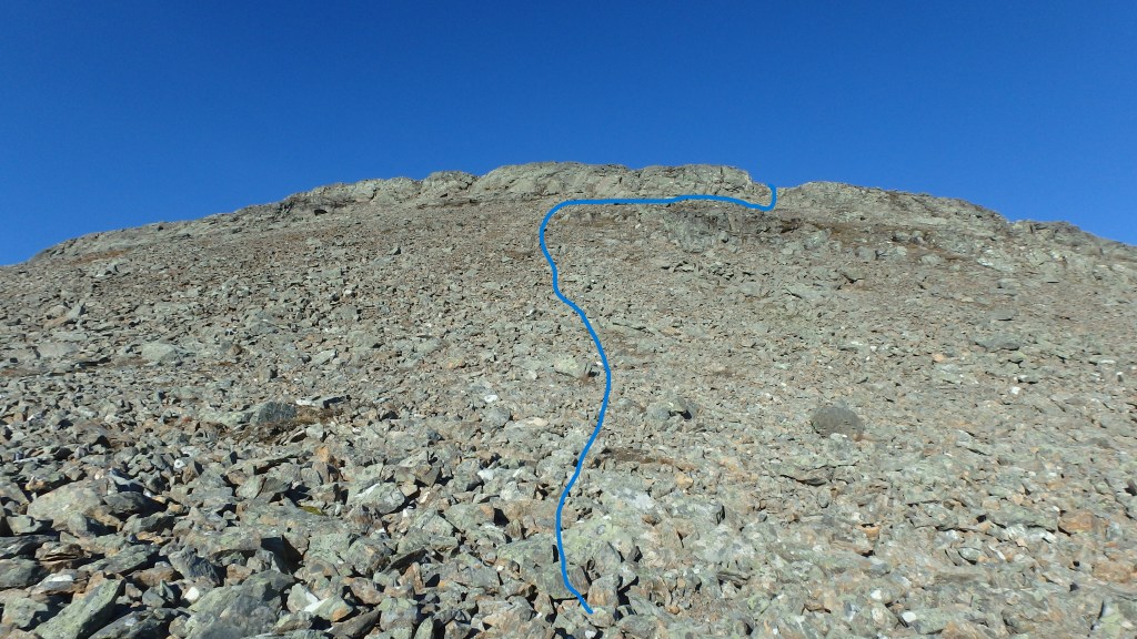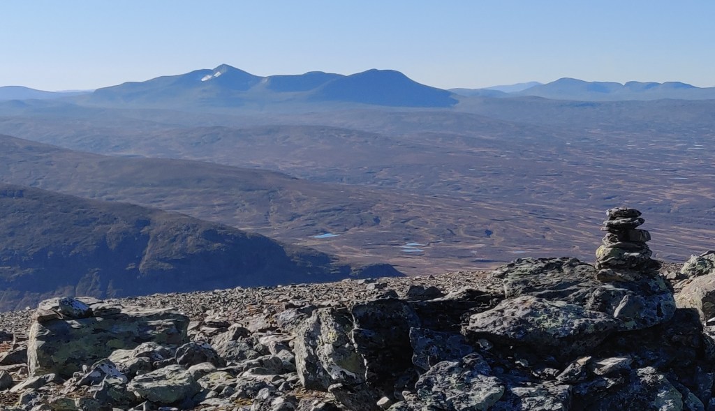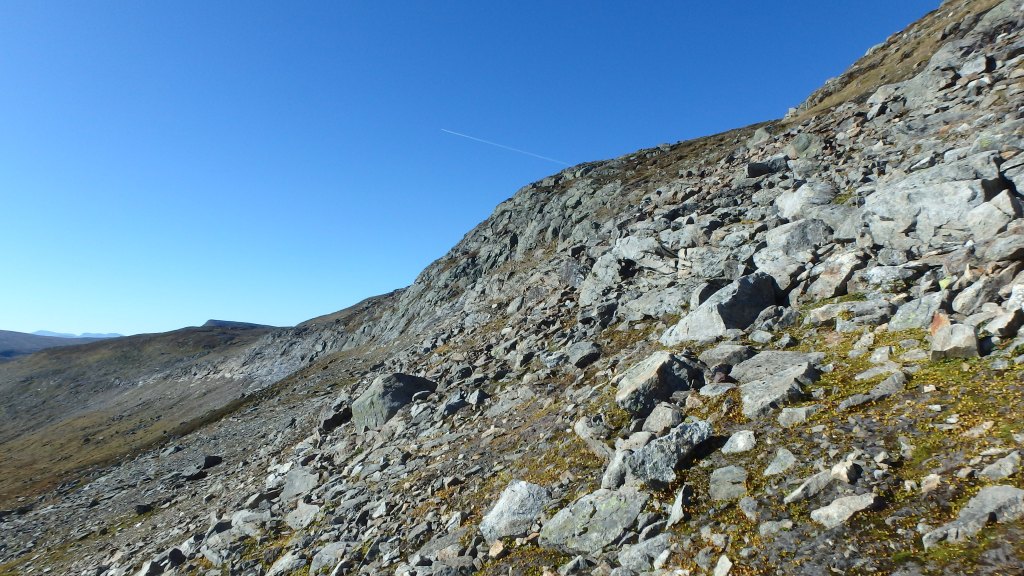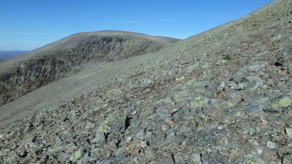 Jag kommer upp till rasbranten med stenar i alla storlekar och spanar in branten ovanför. Det ser ut att finnas en liten klyfta däruppe som kan erbjuda en passage, att runda åt något håll ser inte möjligt ut. En försiktig scrambling på alla 4 börjar för att känna så att stenarna är stabila nog, till slut kommer jag upp på en liten platå och kan ta mig bort till klyftan. Det funkar, det är inga problem att komma upp, hoppas bara att jag inte behöver ned samma väg. Jag memorerar för säkerhets skull var klyftan är så jag kan hitta dit uppifrån om det behövs. Väl uppe på förtoppen är det en flack platå med grymma vyer i 360 grader.