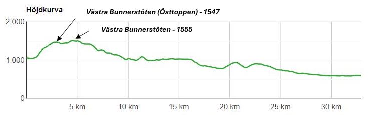 Efter en kort paus är det bara att fortsätta ytterligare 1 km bort till västtoppen, högsta punkten på Västra Bunnerstöten med 1555 möh. Den kilometern är ännu flackare, bred och lättframkomlig hela vägen. Framme på toppen är det bara att njuta av ett 360 graders panorama över en stor del av Väst-Jämtland.