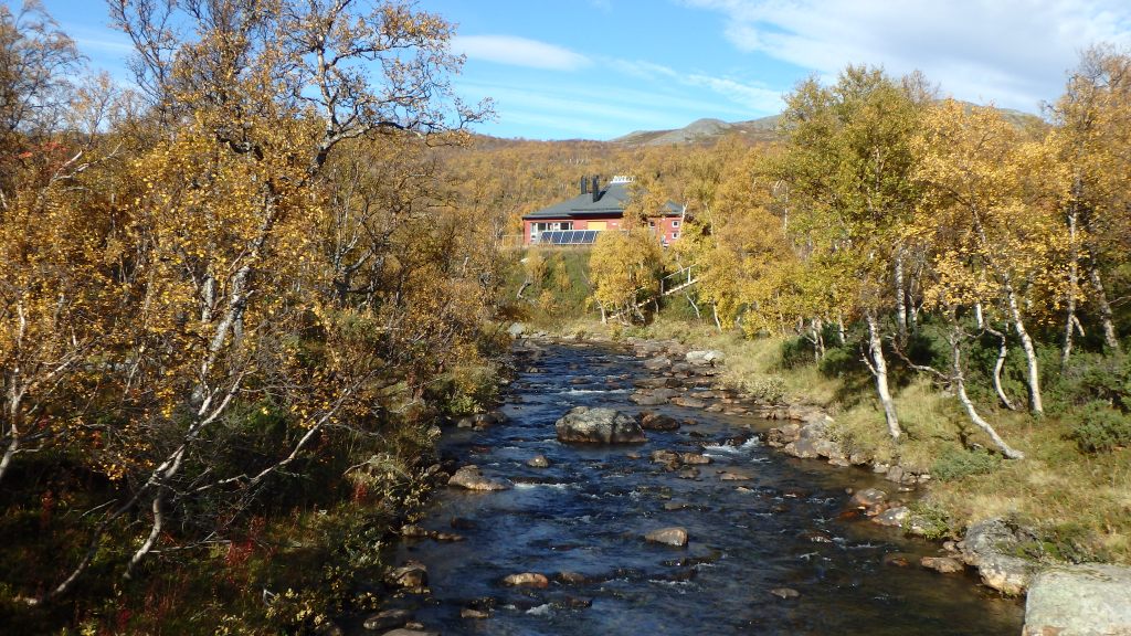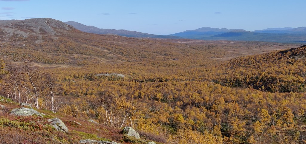 Efter lunchstoppet är det bara 3 km kvar fram till leden, men här blir det en aning bökigare med en del snärjig vegetation att ta sig igenom eller runda. Jag kommer i varje fall fram till leden och snart breder björkskogen ut sig i glödande höstfärger. Stensdalstugan ligger mitt i det glödande landskapet, det blir målet för nästa stopp för att fixa lite kaffe, fylla på energi och vatten innan sista rycket ned till Nulltjärn. Där får jag också se de första människorna på dessa 2 dagar, det är inte trångt i fjällen.