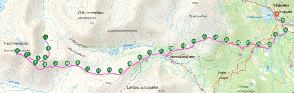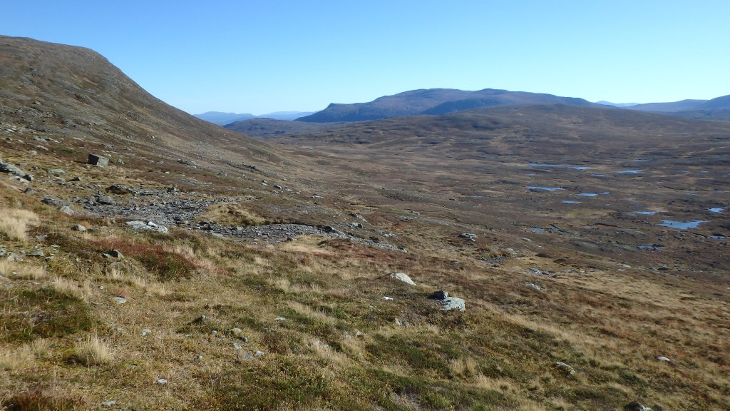 Nu kan jag inte sitta och njuta av vyerna och lugnet hur länge som helst, visserligen är det inga fler toppar kvar den här gången, men jag har nära 3 mil ”hem” till bilen vid Nulltjärn. Den första milen är stiglös tills jag kommer ned till leden mellan Stensdalsstugan och Gåsen. På vägen mellan topparna här uppe har jag spanat in att det borde gå att komma ned på skrå om man håller sig högt upp på sydsidan, då slippar jag ta mig ned i förtoppens stenbrant. Jag försöker tolka tätheten på kartans kurvor och bedöma en möjlig väg utan branter och det lyckas. Efter 5 km med många stenfält och någon brant att passera är jag nere nära 1000 m.ö.h. och det planar till slut ut.